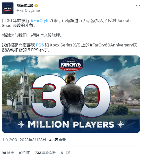 育碧游戏官方推特账号发布推文,宣布《孤岛惊魂5》玩家人数已突破 3000 万。