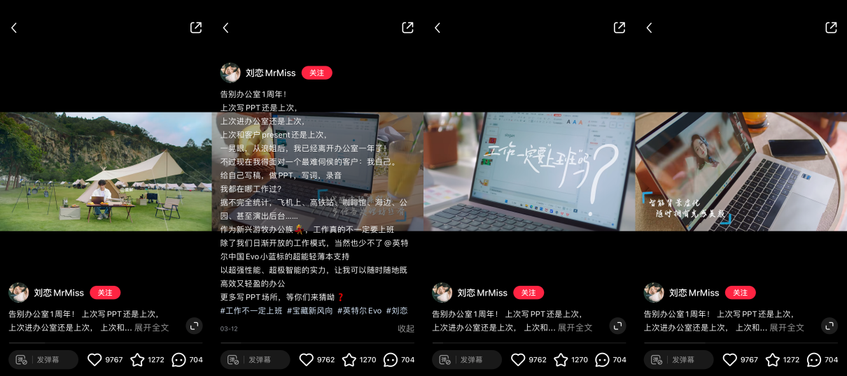 这场解读以短片形式呈现,由明星刘恋带头演绎,作者林安观点背书,@三多同学、@童解和@王秋怡秋秋等数位职业KOL多场景深度展示,以「走出写字楼、解锁办公新姿势、沉浸式居家办公」等多角度种草,持续深化用户对英特尔新品Evo超能轻薄本的产品认知。