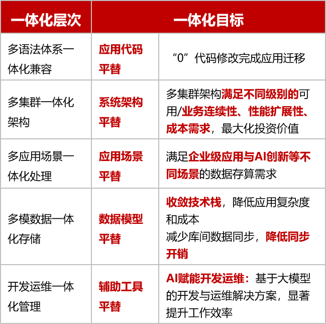 多应用场景一体化处理:打破TP/AP的传统藩篱。数据库需同时应对交易处理(TP)、分析处理(AP),并进一步细化支撑时序分析、日志处理、AI推理等新兴场景。融合架构确保“一个平台,支持多种场景”,避免业务割裂。