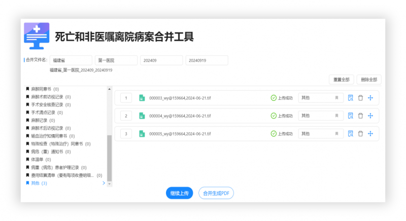 规范命名,一键生成:合并后的PDF文件按“省份_医院_病案号_出院日期”格式自动生成命名,符合HQMS平台上报规范;